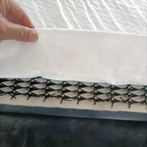 復合排水網是一種新型的排水土工材料。以高密度聚乙烯(HDPE)為原料,經特殊的擠出成型工藝加工而成,具有三層特殊結構。中間筋條剛性大,縱向排列,形成排水通道,上下交叉排列的筋條形成支撐防止土工布嵌入排水通道,即使在很高的荷載下也能保持很高的排水性能。雙面粘接滲水土工布復合使用,具有“反濾--排水--透氣--保護”綜合性能,是目前最理想的排水材料。